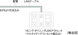 マルチメディアコンセントコンセント、TVアウトレット、LANを一体化し、ワンプレートにまとめた使いやすい多機能コンセントをリビング・ダイニングに1ヶ所設置。