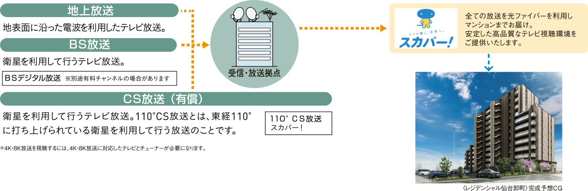 BSデジタル放送(4K8K衛星放送等を含む。)、110°CS放送(スカパー!)がアンテナの設置無しで楽しめます。