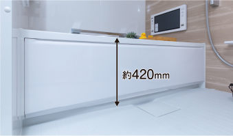 浴槽は、またぎ高を約420mmと低く設定した低床型バス。さらに、安全性を考慮して手摺も設けたバリアフリー設計です。床には足元の冷たさを軽減する床を採用。快適なバスタイムがお楽しみいただけます。