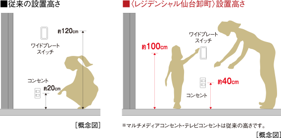 スイッチはプレート面が広く、軽く触るだけで点灯・消灯の操作ができるワイドスイッチを採用し、お子様でも手が届きやすい様、床から約100cmの位置に設置しました。また、抜き差しの多いコンセントは、あまり腰をかがめる必要のない様、床から約40cmの位置に設けています。