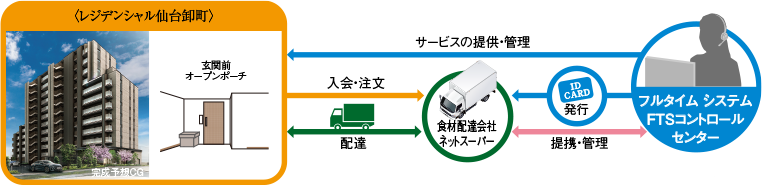 [概念図] 食材配達会社※1から購入した食材などをセキュリティレベルを保ちながらご不在時でも各住戸玄関前オープンポーチまでお届けします。外出のときも、お届けが可能です。重いお荷物を運ぶ手間がかかりません。