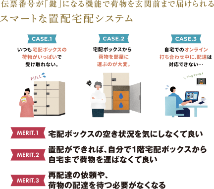 宅配便の荷物の伝票番号を認証キーとしてオートロックを解錠できるので、居住者が不在でも各住戸玄関前オープンポーチまで確実に配達できます。ヒトではなくモノ認証なので、誤配送やなりすましの予防効果も。利便性とセキュリティを備えたスマートな宅配システムです。