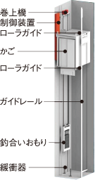 災害などで、万一昇降路に水が流れ込んだ場合、駆動部や制御装置が直接水にさらされにくい「巻上機上部設置方式」を採用。また、「ピット冠水管制運転」を標準装備。