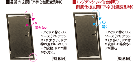 地震時に玄関ドアが開かず、外への脱出が不可能にならないよう、玄関ドア枠には耐震ドア枠を採用しています。