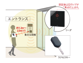 ラクセスキーをカバン等に携帯してリーダに近づくだけ(約1.3m~2.0m※1)でエントランスの自動ドアを解錠できます。
