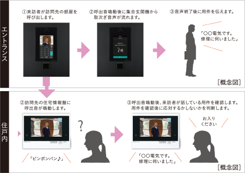 お部屋で通話に入る前に来訪者の名前、訪問用件の確認が可能。訪問販売や勧誘などの不要な応対を減らすことができます。