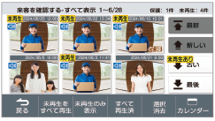留守中に来訪者からの呼び出しがあると、メニュー画面のボタンがオレンジ色に点灯。タッチすると来訪者の録画映像が時系列で一覧表示します。また、右下の「カレンダー」をタッチすれば来客のあった日と録画件数も一目で確認できます。