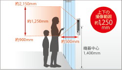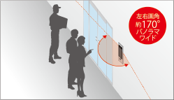 集合玄関機、カメラ付玄関子機の映像は左右画角約170°でほぼ真横まで確認できます。カメラから離れた位置にいる来訪者や、カメラを避ける不審者も映します。